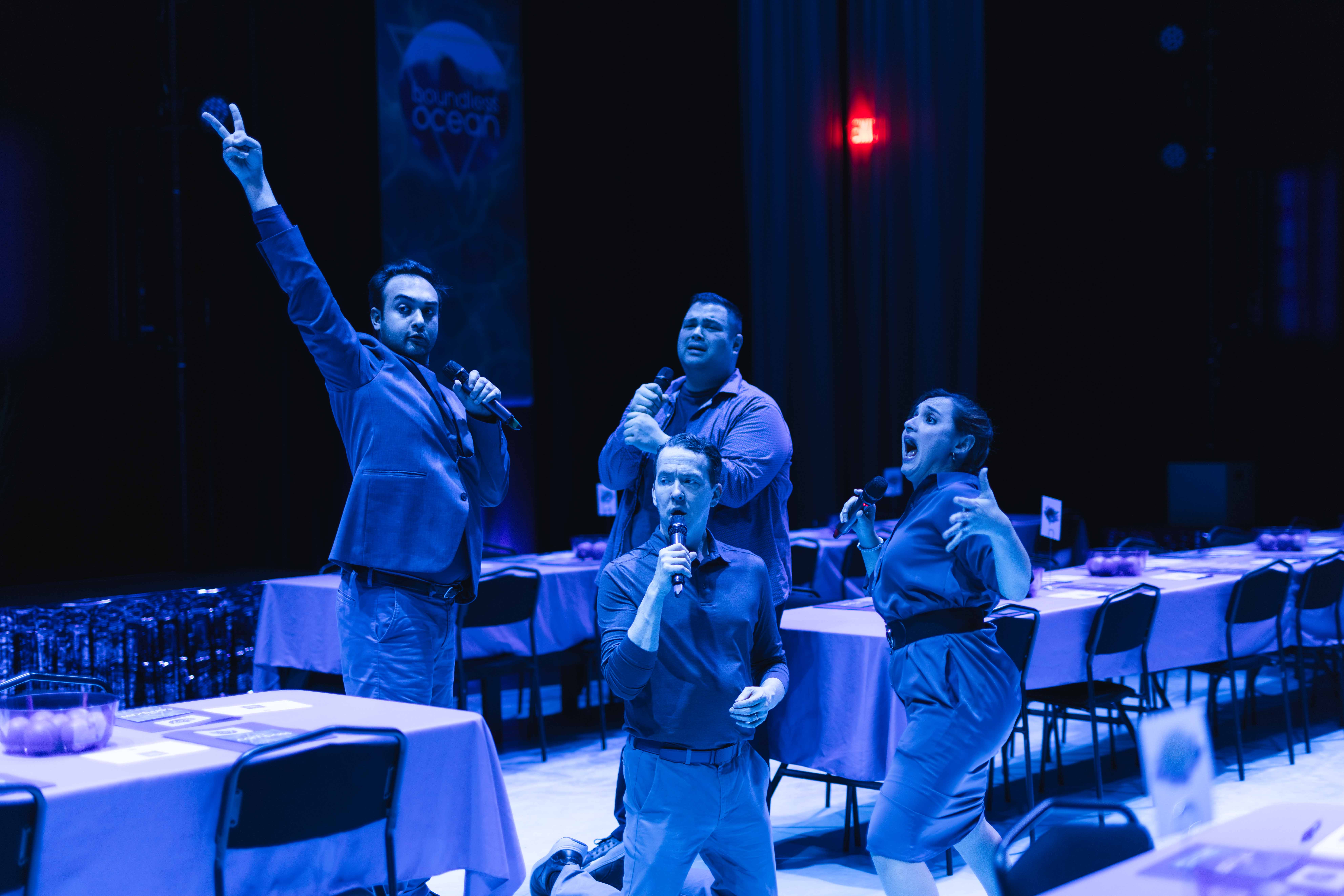 Welcome to the Boundless Ocean Productivity Bootcamp, replete with conference tables; nametags; multimedia screens; and workbooks for achieving personal and professional goals. Your mysterious facilitators promise that when the countdown clock expires, participants will finally know how to “do it all” before they run you through absurd exercises in life-hacking and action planning… but “on top of things” feels even further out of reach. It’s only a matter of time before the façade finally cracks, revealing the existential toll of perpetual striving.